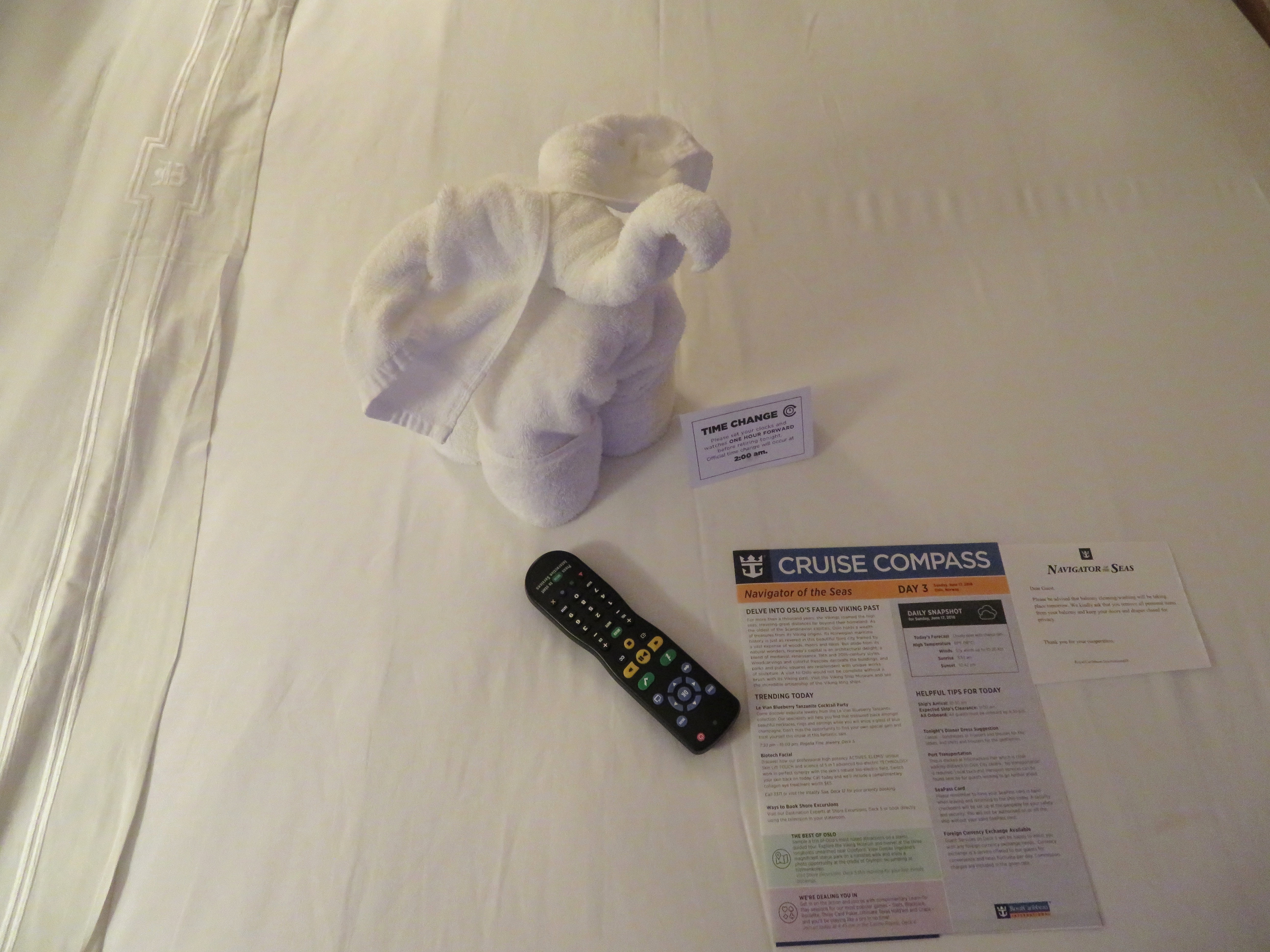 On some evenings when you return to your cabin you can sometimes find animals on your bed made out of towels by your cabin steward. This is always something I look forward to when returning to the cabin of an evening.