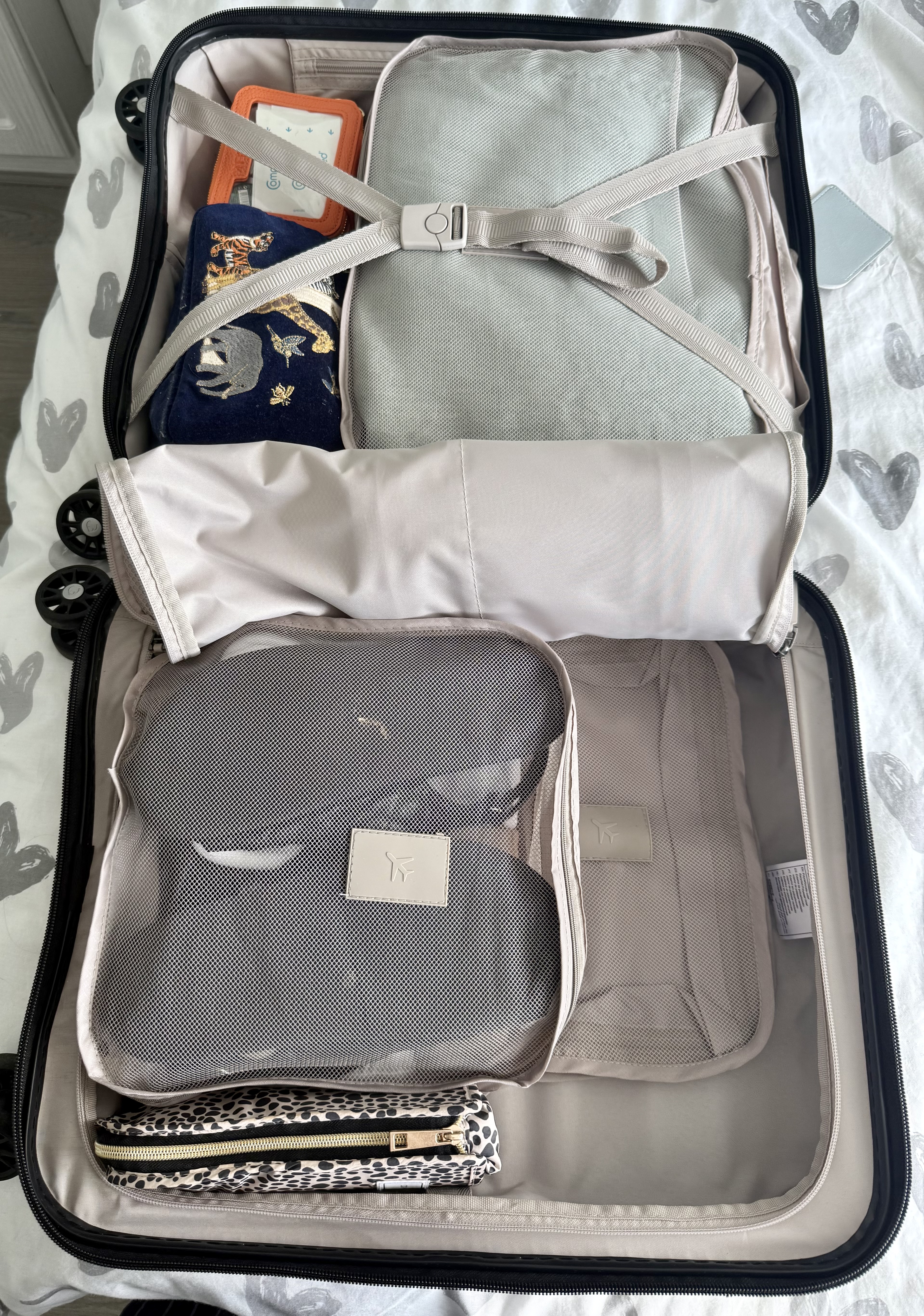 When planning my outfits I try to keep it minimal by taking items that can be worn more than once such as trousers and tops that will go with more than one item of clothing. I will also limit the amount of footwear I take by traveling in trainers and then only pack one set of footwear which is likely to be a comfortable pair of sandals. Comfortable footwear is important for a city break as you are likely to be doing a lot of walking. If I’m going somewhere that will require a coat I won’t pack this in the case as I will choose to wear it on the plane. If I’m going to require jumpers I will pack thin ones so that they don’t take up too much in the case as well as packing some thermal long sleeve tops for under the jumpers. Once I’ve decided what clothes I’m going to be taking with me I will always use a packing cube to put the clothes in as this is another way to help save space in the case as well as a way to keep things compact.